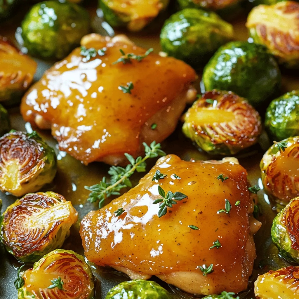 Place the chicken thighs on the baking sheet. Brush a good amount of the maple Dijon sauce on each thigh. Don’t waste any sauce! Next, add the halved Brussels sprouts to the sheet. Drizzle the rest of the sauce over them. Toss the sprouts so they get coated evenly. Make sure everything spreads out in one layer. This helps it cook evenly. Now, you are ready to roast! Pop the baking sheet into the oven for 25 to 30 minutes. Check that the chicken reaches 165°F (75°C) inside. The Brussels sprouts should also be tender and caramelized. Once done, let it rest for a few minutes. Garnish with fresh thyme leaves for a nice touch.