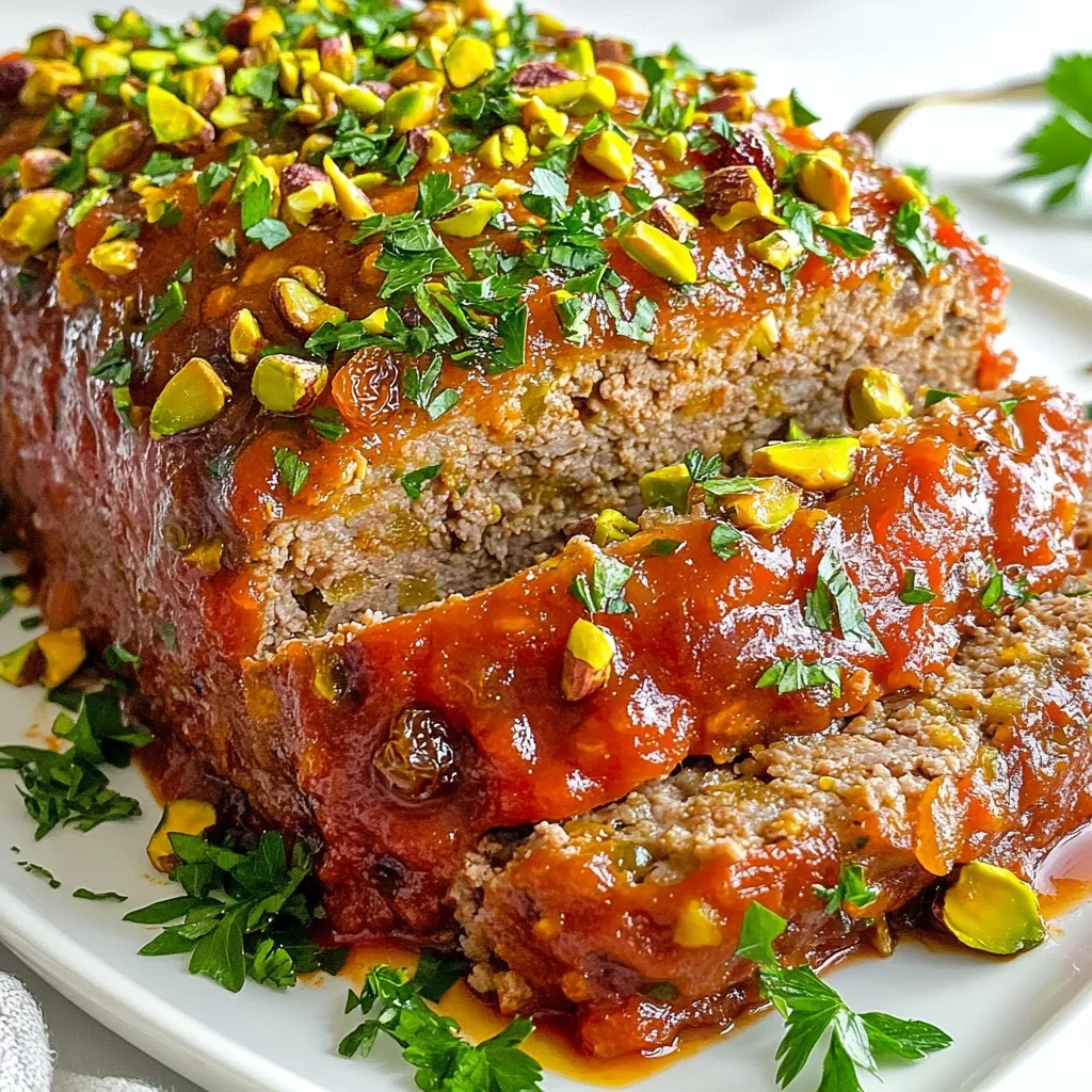 A flavorful meatloaf combining ground beef and pork with pistachios and raisins, topped with marinara sauce.