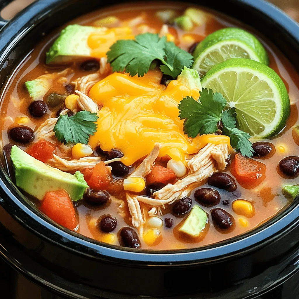 - 1 lb boneless, skinless chicken breasts - 1 can (15 oz) black beans, drained and rinsed - 1 can (15 oz) corn, drained - 1 can (10 oz) red enchilada sauce - 1 can (14.5 oz) diced tomatoes with green chilies (undrained) - 1 medium onion, diced - 2 garlic cloves, minced - Spices: 1 teaspoon cumin, 1 teaspoon chili powder, 1/2 teaspoon smoked paprika - 4 cups chicken broth - Salt and pepper to taste - 1 cup shredded cheddar cheese - Chopped fresh cilantro - Avocado slices - Lime wedges When I cook this slow cooker chicken enchilada soup, I rely on these ingredients. They make a rich and tasty base. The chicken breasts are the star. They stay tender and juicy. The black beans and corn add fiber and sweetness. The red enchilada sauce gives a bold kick. The diced tomatoes with green chilies add freshness and spice. For seasoning, I use a diced onion and minced garlic. They build flavor and aroma. Cumin, chili powder, and smoked paprika warm up the dish. I always taste and adjust salt and pepper last. Finally, I love to top each bowl with shredded cheddar cheese, fresh cilantro, avocado slices, and a squeeze of lime juice. These add creaminess and brightness to each bite. - Layer the chicken in the slow cooker. - Add onion and garlic on top. Start with boneless, skinless chicken breasts. Place them at the bottom of your slow cooker. This helps the chicken soak up all the flavors. Next, dice one medium onion. Mince two garlic cloves. Sprinkle the diced onion and minced garlic over the chicken. The onion adds sweetness, while garlic gives a nice kick. - Pour black beans, corn, enchilada sauce, and diced tomatoes. - Add spices and chicken broth. Now it’s time to add more flavor. Open a can of black beans and a can of corn, and drain them. Pour these into the slow cooker. Next, add a can of red enchilada sauce. This sauce makes the soup rich and tasty. Then, pour in a can of diced tomatoes with green chilies. Don't drain this can; the juices add moisture. Sprinkle in one teaspoon of cumin, one teaspoon of chili powder, and half a teaspoon of smoked paprika. These spices really boost the flavor! Finally, add four cups of chicken broth to make the soup nice and soupy. - Cover and set cooking time. - Shred chicken and finalize the soup. Cover your slow cooker. Set it to cook on low for 6-8 hours or on high for 4 hours. When the chicken is tender, it’s time to shred. Carefully take the chicken out and use two forks to shred it. Return the shredded chicken to the soup and stir well. Check the taste. If it needs a little more salt or pepper, add some now. Your soup is ready! Serve it hot and enjoy! How can I adjust spice levels? You can easily change the spice level to fit your taste. If you want more heat, add extra chili powder or diced jalapeños. For less heat, reduce the chili powder or skip the diced tomatoes with green chilies. What are some tips for shredding chicken easily? To shred chicken easily, let it cool for a few minutes after cooking. Use two forks to pull the chicken apart. This method works well and keeps your hands safe. What is the difference between low and high cooking time? Cooking on low takes about 6-8 hours, while high only takes 4 hours. The slow cook on low makes flavors blend better. It also keeps the chicken very tender. What are the benefits of cooking on low? Cooking on low lets the flavors develop fully. It makes the chicken juicy and tender. Plus, you can set it in the morning and come home to a warm meal. What are some suggestions for additional toppings? You can add many toppings to make the soup even better. Consider more shredded cheese, sour cream, or sliced jalapeños. Fresh cilantro and avocado also add a nice touch. What side dishes pair well with this soup? This soup goes well with tortilla chips or warm tortillas. You can also serve it with a simple salad for a fresh touch. {{image_2}} You can change the recipe by swapping beans or veggies. Use pinto beans or chickpeas instead of black beans. Try adding bell peppers, zucchini, or corn for a fresh twist. These swaps keep the flavors bright and fun. You can also switch proteins. If you prefer turkey, use ground turkey instead of chicken. For a plant-based option, try tofu. Just cube it and add it to the pot. These swaps give you new flavors while keeping it hearty. To make this soup gluten-free, check your enchilada sauce. Most brands are safe, but some may have gluten. Use corn tortillas for dipping or crumbling on top. For a vegan version, leave out the chicken and broth. Use vegetable broth instead. You can also add extra beans or lentils for protein. Top the soup with vegan cheese or avocado for creaminess. There are many fun ways to serve this soup. It works great for taco night. Just set out toppings like cheese, sour cream, and salsa. Everyone can build their bowl just how they like. You can also use it for lunch prep. Store it in containers for easy meals throughout the week. The soup pairs well with warm tortillas or crusty bread. Just scoop and enjoy! To store leftovers, let the soup cool first. Use airtight containers to keep it fresh. Glass or BPA-free plastic containers work best. Fill the containers, leaving some space at the top. This helps prevent spills when sealing. Label the containers with the date. This way, you know when to eat it. For freezing soup, use freezer-safe containers. You can also use heavy-duty freezer bags. Make sure to leave some space in the bags for expansion. Seal the bags tightly to avoid air. To thaw, move the soup to the fridge overnight. To reheat, use the stove or microwave. Heat slowly, stirring often to ensure even warmth. In the fridge, the soup lasts about three to four days. In the freezer, it can last up to three months. Always check for any off smells or changes in color. If it looks or smells bad, it’s best to toss it. Keeping track of these time frames helps avoid waste and ensures tasty meals. Can I use frozen chicken? Yes, you can use frozen chicken. 