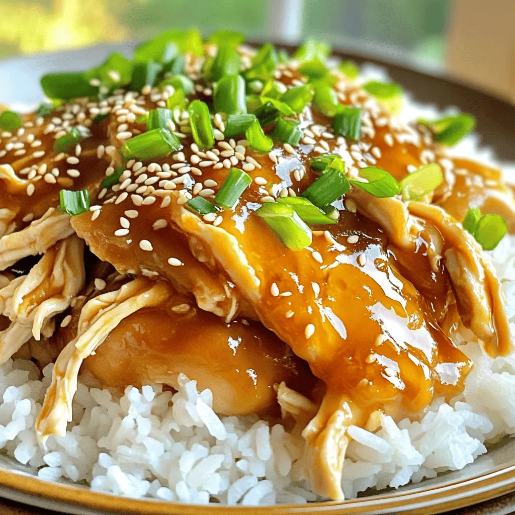 After the sauce thickens, return the shredded chicken to the slow cooker. Stir well to coat the chicken in the thickened sauce. Serve the teriyaki chicken over warm rice. For a nice finish, sprinkle with 1 teaspoon of sesame seeds and 2 chopped green onions. Enjoy your delicious meal!