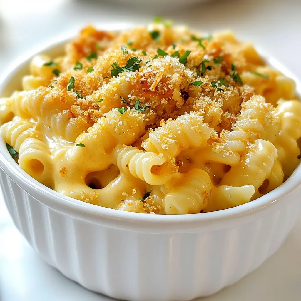 If you want a crispy top, preheat your oven to 350°F (175°C). Pour the mac and cheese mixture into a greased baking dish. Optional: Sprinkle 1/2 cup of breadcrumbs on top. Bake for 15-20 minutes until it is golden and bubbly. Once done, take it out of the oven, garnish with fresh chopped parsley, and serve right away.