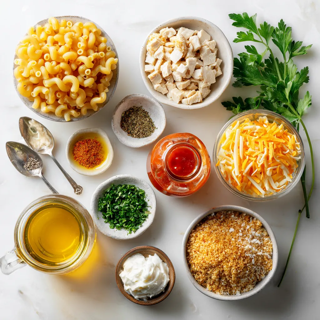- 2 cups elbow macaroni - 1 lb chicken breast, diced - 1 cup sharp cheddar cheese, shredded - 1 cup mozzarella cheese, shredded - 1/2 cup cream cheese, softened - 1/4 cup honey - 2 tablespoons hot sauce (adjust to taste) - 2 tablespoons olive oil - 1 teaspoon garlic powder - 1 teaspoon onion powder - Salt and pepper to taste - 1/2 cup breadcrumbs (optional for topping) - Fresh parsley, chopped (for garnish) - Elbow macaroni: 2 cups is about 8 ounces, perfect for this dish. - Chicken breast: 1 lb yields about 3-4 servings, ideal for four people. - Cheeses: Use 1 cup each of sharp cheddar and mozzarella for a rich, creamy texture. - Cream cheese: 1/2 cup helps bind everything and adds a nice creaminess. - Honey: 1/4 cup gives that sweet touch to balance the heat. - Hot sauce: Adjust the 2 tablespoons based on your heat preference. - Olive oil: 2 tablespoons help cook the chicken evenly. - Seasonings: 1 teaspoon each of garlic and onion powder adds depth to flavor. - Breadcrumbs: 1/2 cup is optional for a crunchy topping. - Parsley: Fresh is best for garnish and color. - Macaroni: Barilla or Ronzoni for great texture. - Cheeses: Kraft for cheddar and Galbani for mozzarella. - Cream Cheese: Philadelphia is the gold standard. - Honey: Local or Manuka honey offers the best flavor. - Hot Sauce: Frank’s RedHot or Sriracha give great heat without overpowering. - Olive Oil: Extra virgin from brands like California Olive Ranch is ideal. - Breadcrumbs: Progresso or homemade for the best crunch. This blend of ingredients makes Spicy Honey Chicken Mac and Cheese a delightful dish. Each item contributes to the flavor and texture, ensuring a satisfying meal. {{ingredient_image_1}} First, grab a large pot. Fill it with water and add salt. Bring the water to a boil. Once it boils, add 2 cups of elbow macaroni. Cook it according to the package directions. You want the pasta to be al dente, so check it a minute early. After cooking, drain the macaroni and set it aside. Next, take a large skillet. Heat 2 tablespoons of olive oil over medium heat. Add 1 pound of diced chicken breast to the skillet. Season the chicken with 1 teaspoon of garlic powder, 1 teaspoon of onion powder, salt, and pepper. Cook the chicken for about 5-7 minutes. You want it to be cooked through and golden brown. In a small bowl, mix together 1/4 cup of honey and 2 tablespoons of hot sauce. This makes your spicy honey sauce. Once the chicken is cooked, pour the sauce over the chicken in the skillet. Toss the chicken to coat it in the sauce. Cook for another 1-2 minutes until everything is heated through. Now, take a large mixing bowl. Add the cooked macaroni, the spicy honey chicken, and 1/2 cup of softened cream cheese. Also, add 1 cup of shredded sharp cheddar cheese and 1 cup of shredded mozzarella cheese. Stir everything together until the cheeses begin to melt and combine well. If you want a crispy top, preheat your oven to 350°F (175°C). Pour the mac and cheese mixture into a greased baking dish. Optional: Sprinkle 1/2 cup of breadcrumbs on top. Bake for 15-20 minutes until it is golden and bubbly. Once done, take it out of the oven, garnish with fresh chopped parsley, and serve right away. To make great mac and cheese, start with the right pasta. Elbow macaroni holds cheese well. Cook it just until al dente. This keeps the pasta firm. Drain it well, but do not rinse. Rinsing washes away the starch. Starch helps the cheese sauce stick. To balance the heat in this dish, use the right amount of hot sauce. Start with two tablespoons. Taste before adding more. Honey brings sweetness and cuts the heat. If it’s too spicy, add more honey. You can also add more cream cheese for a milder taste. Melt cheese slowly for the best results. Mix the cheeses with the warm pasta. As you stir, the heat will help them melt. Adding cream cheese first makes it easier. If you want a gooey texture, use a double boiler. This way, you avoid burning the cheese. Pro Tips Use High-Quality Honey: Opt for pure, high-quality honey for the best flavor. It will enhance the sweetness and complexity of your dish. Adjust the Heat: Feel free to modify the amount of hot sauce according to your spice preference. Start with less if you're unsure, and add more gradually. Cheese Melting Tips: To achieve a creamy consistency, make sure your cream cheese is softened before mixing it with the hot ingredients. This will help it melt smoothly. Breadcrumbs for Crunch: If you like a crunchy topping, consider mixing your breadcrumbs with a bit of melted butter and Parmesan cheese for extra flavor. {{image_2}} You can change the chicken to fit your taste. Try turkey for a leaner option. Shrimp or cooked sausage also works well. For a vegetarian choice, use tofu or chickpeas. These swaps still taste great with the spicy honey sauce. Adding vegetables makes this dish healthier and more colorful. You can toss in cooked broccoli, spinach, or bell peppers. Zucchini or peas can also add a nice touch. Just make sure they are chopped small. This way, they mix well with the cheese and pasta. Cheese is key to creamy mac and cheese. If you want to try different cheeses, go for gouda or pepper jack. These cheeses add unique flavors, too. You can also use a mix of cheeses for a more complex taste. Just remember to keep the same amount of cheese for creaminess. You can store Spicy Honey Chicken Mac and Cheese in the fridge. Use an airtight container to keep it fresh. It lasts for up to three days. Make sure to let it cool before sealing it. You can also divide it into smaller portions for easy meals. If you want to save it longer, freezing is a good option. Place the mac and cheese in a freezer-safe container. It stays good for about two months. Remember to label the container with the date. Thaw it in the fridge overnight before cooking. When you are ready to eat, reheat it slowly. You can use a microwave or oven. If using a microwave, heat in short bursts, stirring in between. For the ove