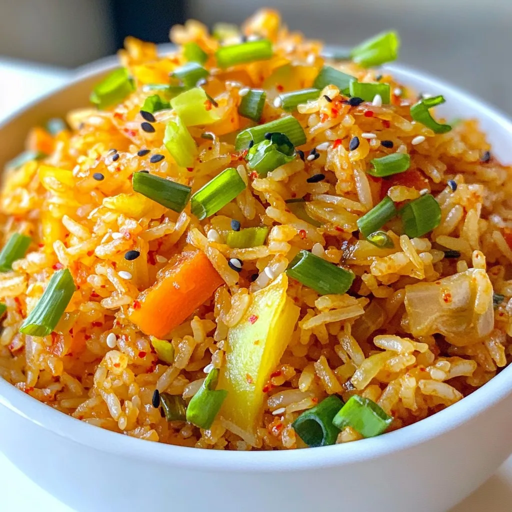 A flavorful and spicy fried rice dish featuring kimchi and vegetables.