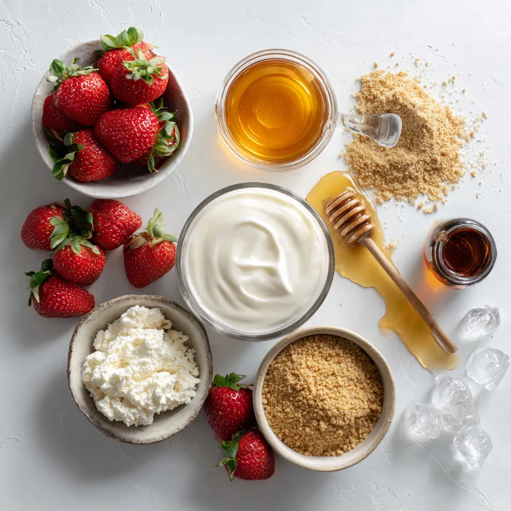 First, gather your fresh strawberries. You need one cup of hulled and halved strawberries. This gives your smoothie a sweet and fruity flavor. Next, take half a cup of cream cheese. Make sure it is softened to mix well. You will also need half a cup of Greek yogurt. You can use plain or vanilla yogurt. It adds creaminess and protein. Don’t forget half a cup of milk, either dairy or non-dairy. This helps everything blend smoothly. Lastly, have two tablespoons of honey or maple syrup ready. This will sweeten your smoothie based on your taste.