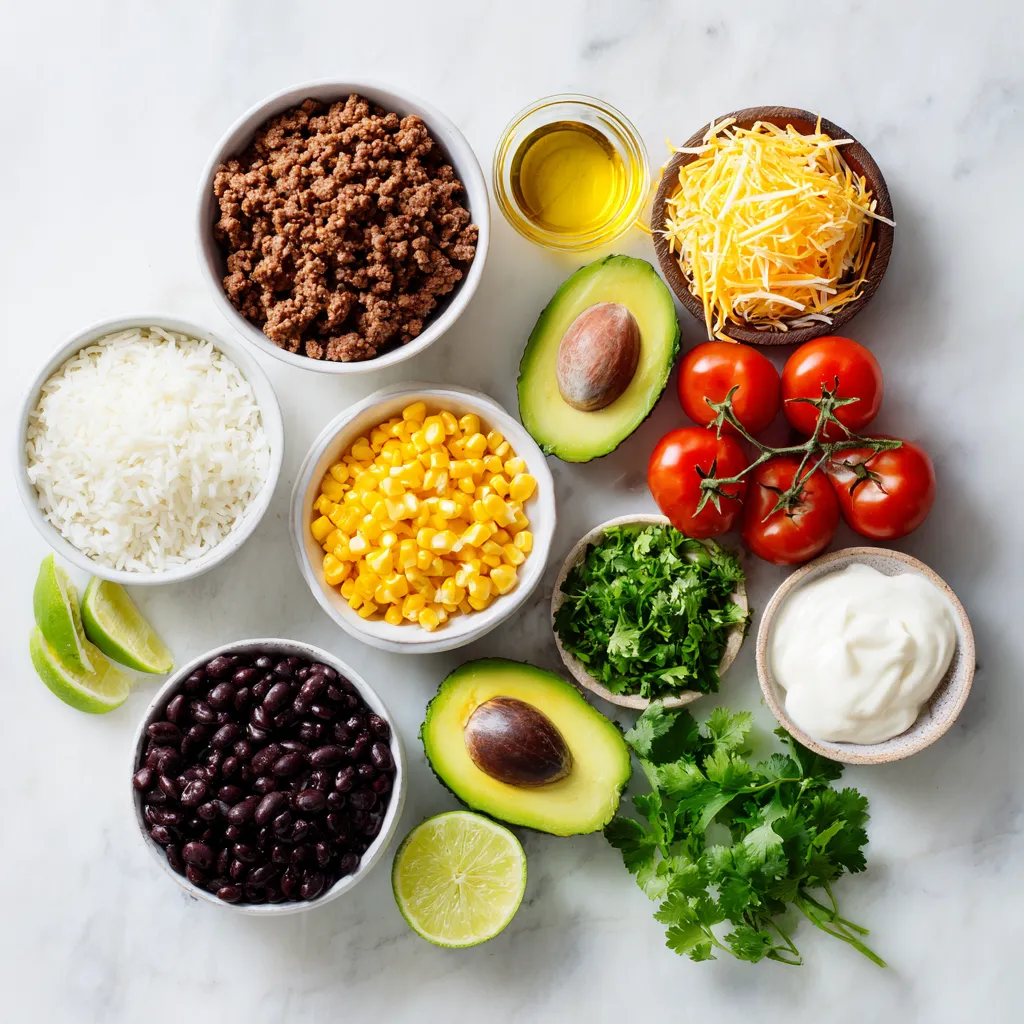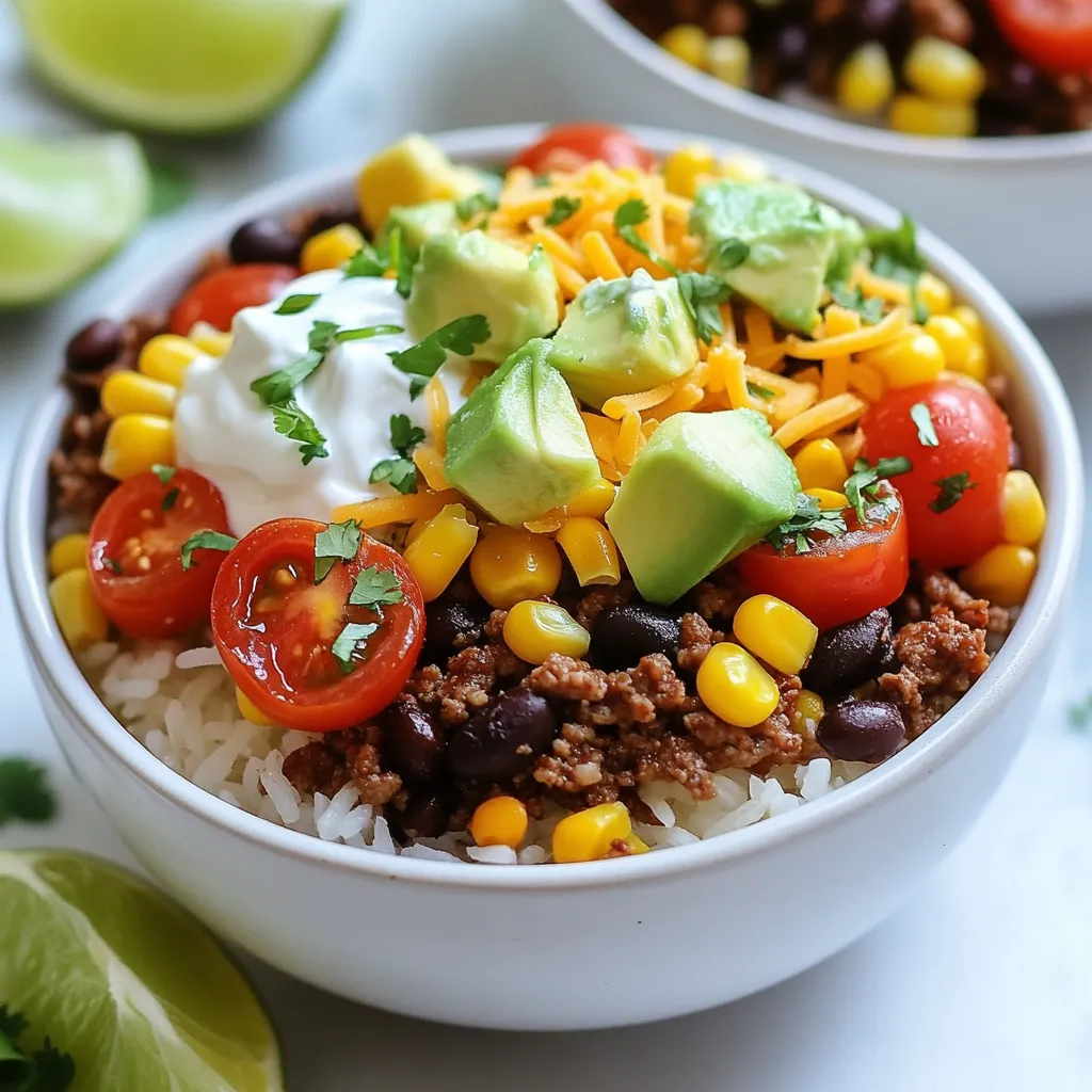 - 1 cup jasmine rice - 1 pound ground beef or turkey - 1 tablespoon olive oil - 1 packet taco seasoning - 1 cup black beans, rinsed and drained - 1 cup corn kernels - 1 cup cherry tomatoes, halved - 1 avocado, diced - ½ cup shredded cheese (cheddar or Mexican blend) - ¼ cup sour cream - ¼ cup fresh cilantro, chopped - Lime wedges, for serving - Salt and pepper to taste If you want to skip meat, try using lentils or mushrooms. These provide protein and taste great. For gluten-free options, use gluten-free taco seasoning and ensure your beans are pure. Quinoa can replace rice for a fun twist. For a bolder taste, add cumin or smoked paprika. These spices boost flavor without much effort. If you want to try new brands, look for organic taco seasonings. They often have cleaner ingredients. You can also adjust spice levels by adding chili powder or cayenne pepper. {{ingredient_image_1}} First, rinse the jasmine rice. Use cold water until it runs clear. This step removes extra starch. Next, put the rice in a medium pot. Add 2 cups of water and a pinch of salt. Bring it to a boil over high heat. Then, lower the heat to low. Cover the pot and let it simmer for 15 minutes. After this time, the rice will be tender. Take it off the heat and let it sit, covered, for 5 more minutes. Fluff the rice with a fork before serving. In a large skillet, heat 1 tablespoon of olive oil over medium heat. Add the ground beef or turkey. Cook it for about 5 to 7 minutes. Break the meat apart with a spoon as it cooks. It should turn brown all over. If there is excess fat, drain it properly. This step helps keep your meal healthy and tasty. Now, it’s time to add flavor. Sprinkle the taco seasoning over the cooked meat. Pour in ½ cup of water and stir well. Let the mixture simmer for 5 minutes. This helps the meat soak up the seasoning. In four bowls, start with a base of jasmine rice. Top each bowl with equal amounts of seasoned meat, black beans, corn, halved cherry tomatoes, diced avocado, and shredded cheese. Finish each bowl with a drizzle of sour cream and a sprinkle of fresh cilantro. Serve lime wedges on the side for an extra burst of flavor. Enjoy your taco rice bowls! To make great rice, use the right water to rice ratio. For jasmine rice, use two cups of water for one cup of rice. This will give you fluffy rice. After cooking, let it rest for five minutes. Fluff the rice with a fork to separate the grains. This keeps the rice light and airy. To boost the meat flavor, try adding garlic powder, onion powder, or smoked paprika. These spices bring depth to your dish. When cooking, choose sautéing over boiling. Sautéing gives meat a nice brown crust. This crust adds a lot of flavor to your taco rice bowls. For serving, use colorful bowls to make your meal pop. Layer the ingredients in the bowls for a nice look. You can also serve taco rice bowls family-style. Place all the ingredients on a table and let everyone build their own bowl. This makes dinner fun and engaging for everyone! Pro Tips Perfectly Fluffy Rice: Rinse your jasmine rice thoroughly to remove excess starch. This will help achieve a fluffier texture once cooked. Meat Alternatives: If you're looking for a healthier option, ground turkey or chicken can be used instead of beef, while still providing great flavor. Customizable Bowls: Encourage everyone to personalize their bowls with their favorite toppings like jalapeños, salsa, or different types of cheese. Fresh Ingredients: Use ripe avocados and fresh cilantro for the best flavor. This will elevate the taste of the entire dish! {{image_2}} You can easily make taco rice bowls vegetarian. Use plant-based meat like lentils or soy crumbles. These options bring good texture and taste. For toppings, think about using grilled peppers, zucchini, and mushrooms. Adding black beans and corn keeps the flavor strong. Don’t forget fresh avocado and diced tomatoes for extra freshness! To make your taco rice bowls vegan, swap out dairy products. Use dairy-free cheese and sour cream. They melt and taste great, just like the real thing. Add more veggie toppings, like roasted sweet potatoes or chickpeas. These will boost protein and flavor. You can even sprinkle some nutritional yeast for a cheesy taste! Taco rice bowls can change based on different cuisines. For a spicy twist, try adding jalapeños or hot sauce. You can also make a Greek version with feta, olives, and tzatziki. If you prefer mild flavors, use sweet corn and mild cheese. The options are endless, and you can mix and match! To store leftovers, let the taco rice bowls cool first. Place them in an airtight container. You can keep them in the fridge for up to three days. When ready to eat, just reheat in the microwave. The shelf life of taco rice bowls is short. They taste best when fresh, but they still work well for a few days. You can freeze individual components for later use. Cooked rice, seasoned meat, and beans freeze well. Just make sure they are cooled before you freeze them. Use freezer bags for easier storage. When it’s time to eat, thaw overnight in the fridge. Reheat in the microwave or on the stove until hot. To make taco rice bowls ahead of time, cook the rice and meat in batches. Store them separately in the fridge. This way, you can mix and match throughout the week. For easy meal assembly, keep toppings like cheese and avocado ready to go. Just add them fresh when you are ready to serve. This saves time and keeps your meals fresh and tasty. To make taco rice bowls gluten-free, swap the taco seasoning with a gluten-free brand. Look for mixes that use corn starch instead of wheat flour. You can also make your own by blending spices like cumin, paprika, and garlic powder. Ensure other ingredients, like canned beans and corn, are labeled gluten-free. Always check labels for cross-contamination. Yes, you can make taco rice bowls ahead of time. Cook the rice and meat and store them separately in airtight containers. Keep the toppin
