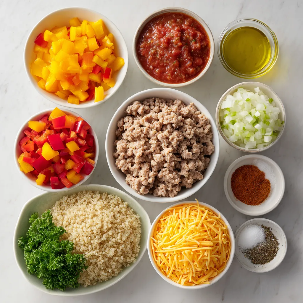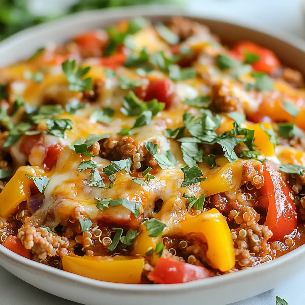 A quick and easy one-pan meal featuring ground turkey or beef, bell peppers, quinoa or rice, and topped with melted cheese.