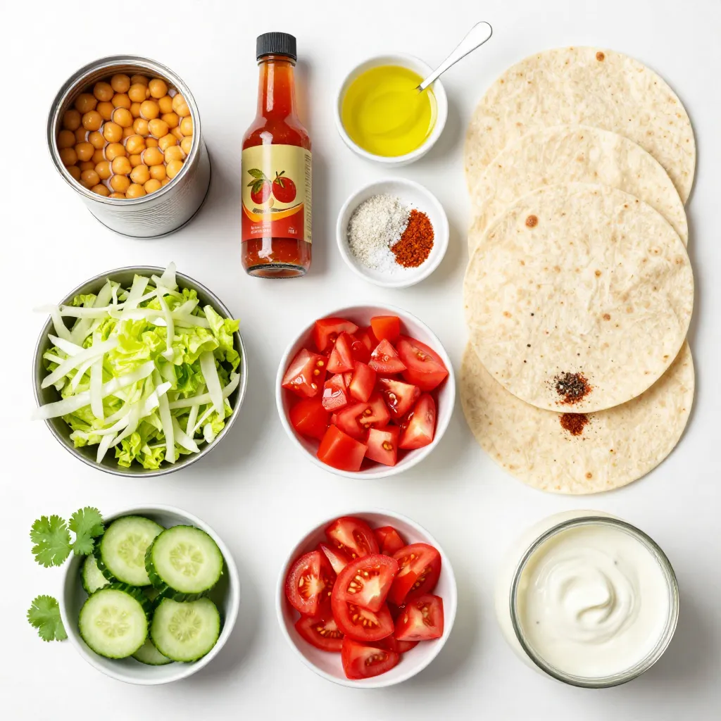 - 1 can (15 oz) chickpeas - 1/4 cup hot sauce - 1 tablespoon olive oil - 1 teaspoon garlic powder - 1 teaspoon onion powder - 1/2 teaspoon smoked paprika - Salt and pepper to taste - 4 large whole grain tortillas or wraps - 1 cup shredded lettuce - 1 cup diced tomatoes - 1/2 cup sliced cucumbers - 1/4 cup vegan ranch dressing - Fresh cilantro or parsley - Extra hot sauce The main ingredients are simple yet packed with flavor. The chickpeas are the star. They give this dish a hearty feel. Hot sauce brings the heat, while olive oil adds richness. Garlic powder and onion powder enhance the taste. Smoked paprika adds a nice touch of smokiness. Don't forget salt and pepper for balance. Now, the additional ingredients make this meal fresh and crunchy. The tortillas or wraps hold everything together. Fresh veggies like lettuce, tomatoes, and cucumbers add crunch and color. Vegan ranch dressing ties it all together with a creamy touch. For optional garnishes, fresh herbs like cilantro or parsley brighten up the dish. If you want more heat, drizzle on extra hot sauce. This combination of ingredients makes your Vegan Buffalo Chickpea Wraps a satisfying and tasty meal! {{ingredient_image_1}} - Preheat your oven to 400°F (200°C). This heat will help make the chickpeas crispy. - In a medium bowl, mash the drained chickpeas with a fork. Leave some chunks for texture. - Add hot sauce, olive oil, garlic powder, onion powder, smoked paprika, salt, and pepper to the mashed chickpeas. Stir well until combined. - Spread the chickpea mixture evenly on a lined baking sheet. Bake for 15-20 minutes, until slightly crispy. - While the chickpeas bake, lay out the tortillas on a clean surface. - Spread a tablespoon of vegan ranch dressing on each tortilla. - Once the chickpeas are done, divide the mixture among the wraps. - Top with shredded lettuce, diced tomatoes, and sliced cucumbers. - Roll the wraps tightly, folding in the ends to secure the filling. - Slice the wraps in half diagonally and garnish with fresh cilantro or parsley. To ensure the chickpeas are crispy, start by spreading them evenly on the baking sheet. Bake at 400°F for 15 to 20 minutes. Keep an eye on them to avoid burning. Let them cool slightly so they maintain their crunch. To prevent wraps from getting soggy, always use fresh tortillas. Spread the vegan ranch dressing just before serving. This keeps the tortillas firm and tasty. Consider using a layer of lettuce directly on the tortilla. It acts as a barrier against moisture. For a great presentation, slice the wraps in half and arrange them on a platter. Drizzle some vegan ranch dressing on the side for dipping. A sprinkle of extra hot sauce adds a nice touch for spice lovers. Use fresh herbs like cilantro or parsley as a garnish. It brightens up the dish and adds color. To add different spices or sauces, consider smoked paprika or cayenne pepper for heat. You can also mix in a bit of lime juice for a zesty kick. Experiment with other sauces like BBQ or teriyaki for unique flavors. For customizing vegetables in the wraps, try adding avocado slices or bell peppers. You can also swap lettuce for kale or spinach for added nutrients. This way, you can make the wraps your own! Pro Tips Adjust the Heat: If you prefer milder flavors, reduce the amount of hot sauce or opt for a less spicy variety. Chickpea Texture: For a creamier texture, blend the chickpeas instead of mashing them. This creates a smoother filling. Wrap Variations: Experiment with different veggies or add avocado slices for extra creaminess and flavor. Meal Prep Friendly: The chickpea mixture can be made ahead of time and stored in the fridge for quick assembly during the week. {{image_2}} You can change the chickpeas to other beans. Black beans or lentils work well. You can also use pinto beans for a different taste. If you want a gluten-free option, try corn tortillas. They add a nice flavor, too. Whole grain wraps are great, but corn tortillas can make it even lighter. Want a sweet twist? Add a bit of maple syrup to the hot sauce mix. This will balance the heat nicely. You can also top your wrap with sliced avocado. It adds creaminess and healthy fats. If you like cheese, try using vegan cheese shreds for a bit of richness. For a gluten-free option, use corn tortillas. They taste great and hold the filling well. If you need a low-carb choice, use lettuce wraps instead. They keep it fresh and crunchy without the carbs. Both options let you enjoy the wrap in a way that fits your diet. After making these wraps, store any leftovers in an airtight container. This helps keep them fresh. They will last in the fridge for about 3 days. Check for any signs of spoilage before eating. You can freeze the wraps for later. Wrap each one tightly in plastic wrap, then place them in a freezer bag. This keeps them safe from freezer burns. To reheat, thaw in the fridge overnight. Then, heat in the oven or microwave until warm. Prepping ingredients ahead of time makes life easier. You can mash the chickpeas and mix in the spices a day in advance. Store the mixture in the fridge. When you’re ready to eat, just assemble the wraps. This way, you have quick meals ready in no time! You can make simple vegan ranch dressing at home. Here is a quick recipe: - 1/2 cup vegan mayo - 1/4 cup almond milk - 1 teaspoon garlic powder - 1 teaspoon onion powder - 1 tablespoon lemon juice - Salt and pepper to taste Mix all these ingredients in a bowl. Adjust the spices as you like. This dressing is creamy and tasty. It goes great with many dishes. Yes, you can prepare the wraps ahead of time. Here are some tips: - Make the chickpea filling and store it in the fridge. - Prepare the vegetables and keep them in separate containers. - Assemble the wraps just before serving. This way, they stay fresh and crunchy. You can eat them for lunch or dinner easily. These wraps taste great with several sides. Here are some suggestions: - Sweet potato fries for a crispy treat.