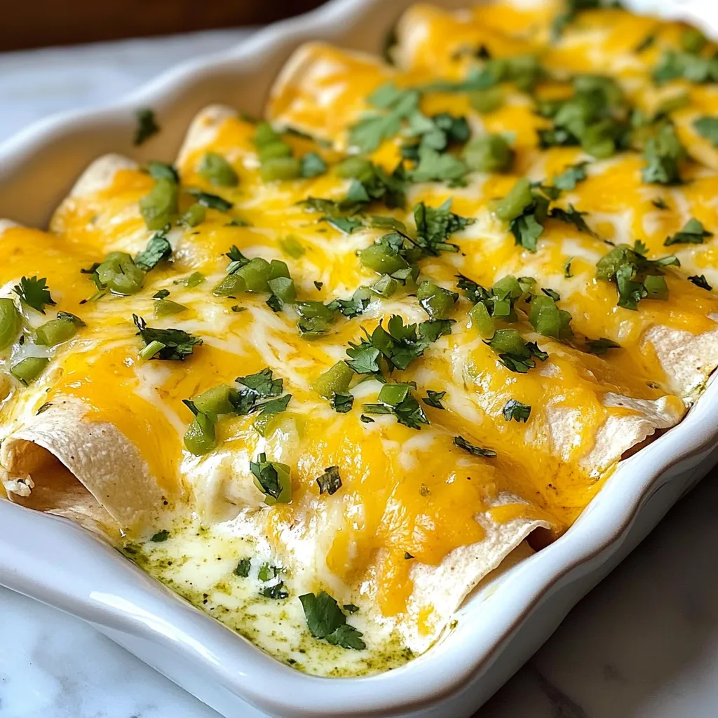 Delicious enchiladas filled with shredded chicken and a creamy sauce, topped with cheese and green chilies.